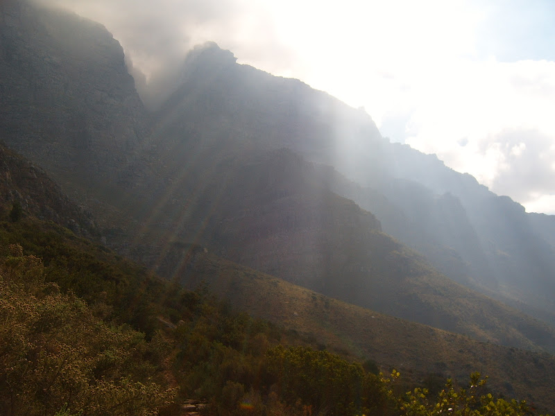 A natural crack in the face of Table Mountain up through which a path is cut, named Platteklip Gorge. You can't see it in the photo but the cloud was actually being sucked down the gorge in a mesmerising spiral, something I'd never seen before. That's why I'm pointing like a dork. |